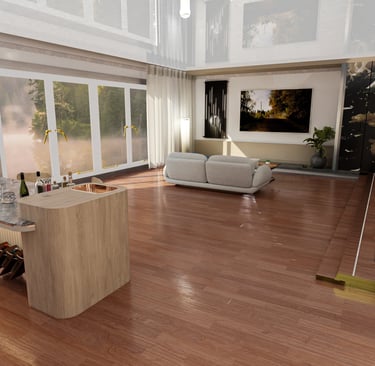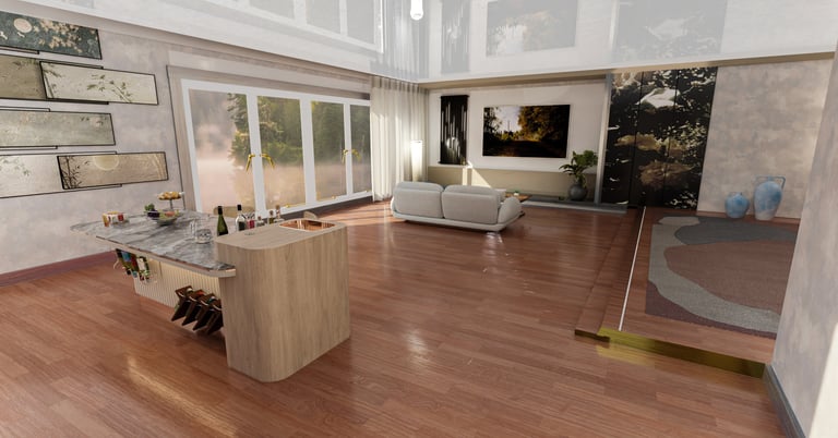 Réalisation d'un salon en bord de lac à des fins de simulation réaliste pour professionnels de l'immobilier et architectes.